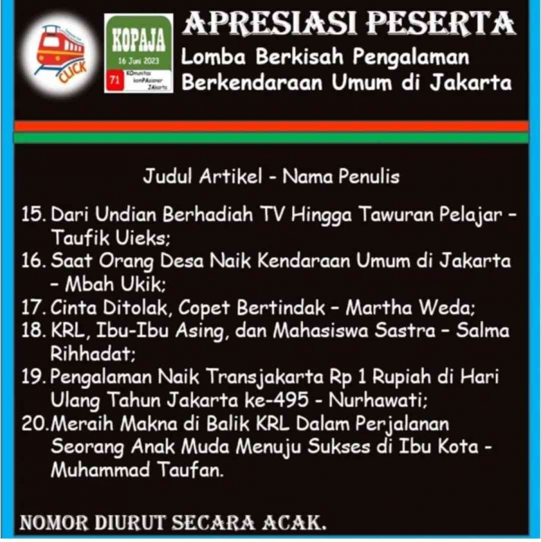 Dua minggu telah berlalu dan ternyata ada 20 artikel yang masuk dari teman-teman kompasianer yang berpartisipasi. Alhamdulillah, kami mengucapkan terima kasih yang sebesar-besarnya kepada teman-teman yang tetap antusias mengikuti event kami.