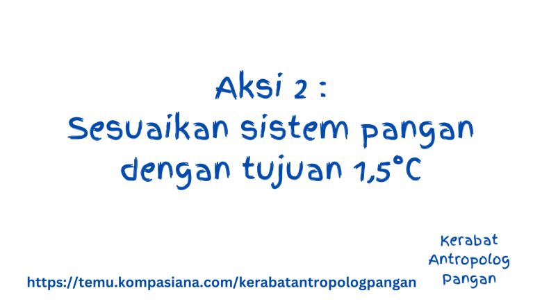Sesuaikan sistem pangan dengan tujuan 1,5°C - Penyesuaian sistem pangan global agar sejalan dengan tujuan untuk membatasi pemanasan global hingga 1,5°C di atas tingkat pra-industri, seperti yang disepakati dalam Perjanjian Paris/Persetujuan Paris. Ini mencakup perubahan dalam cara produksi, distribusi, dan konsumsi pangan untuk mengurangi emisi gas rumah kaca yang dihasilkan oleh sektor pangan. Upaya ini meliputi : transisi menuju pertanian berkelanjutan, pengurangan pemborosan pangan, serta adopsi praktik yang ramah lingkungan, yang secara keseluruhan bertujuan untuk menanggulangi perubahan iklim, menjaga ketahanan pangan, dan meminimalkan dampak negatif terhadap planet ini.