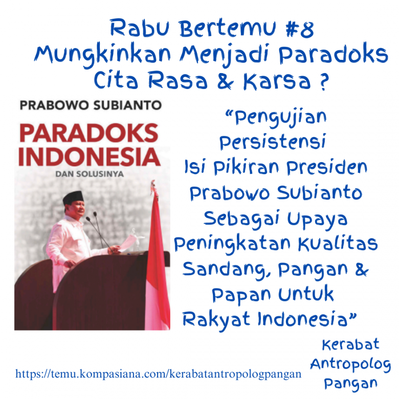 Baiklah, mari kembali pada Rabu Bertemu #8 - Mungkinkah Menjadi Paradoks Cita Rasa dan Karsa ? dengan subjudulnya adalah "Pengujian Persistensi Isi Pikiran Presiden Prabowo Subianto Sebagai Upaya Peningkatan Kualitas Sandang, Pangan & Papan Untuk Rakyat Indonesia".