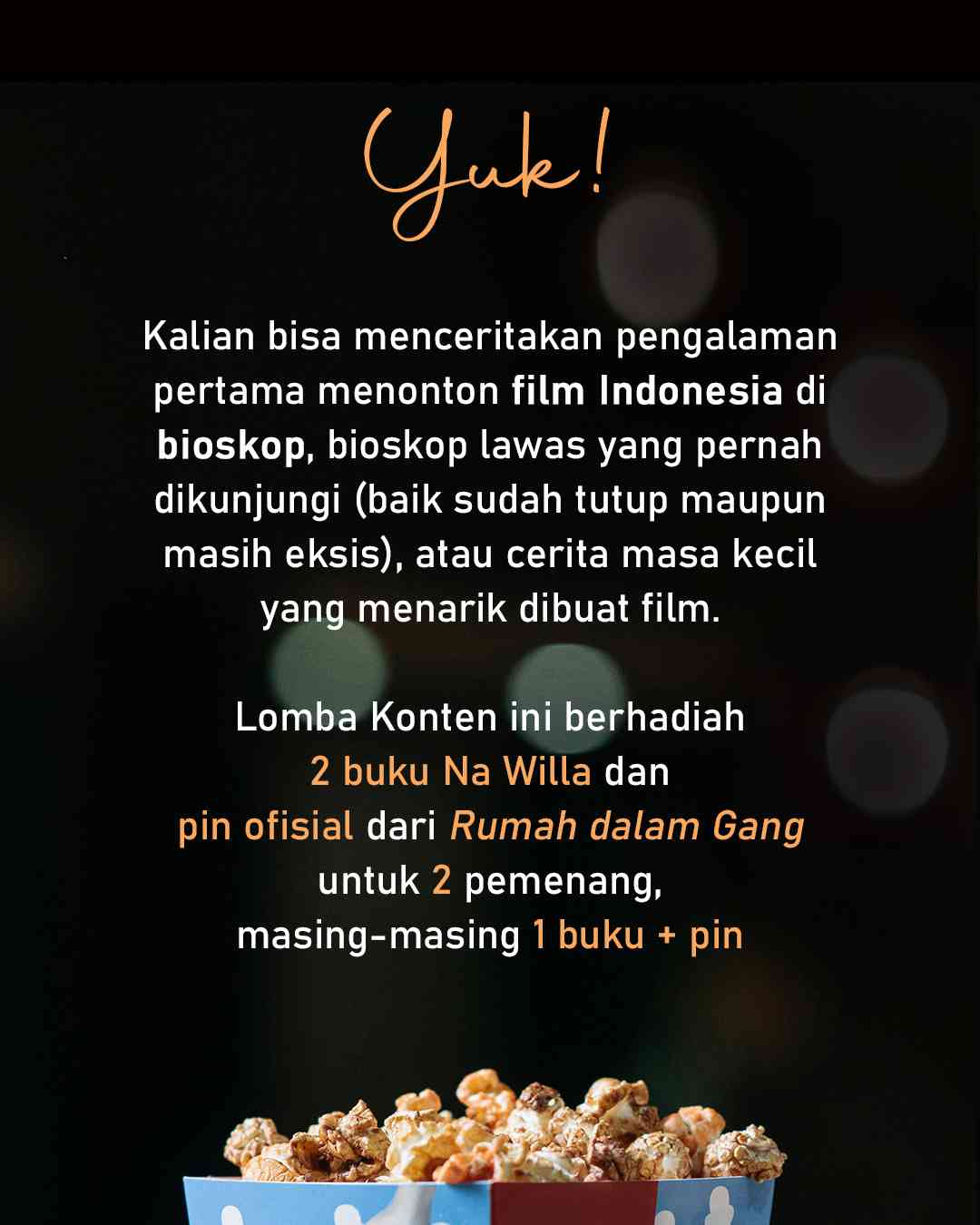 Kalian bisa menceritakan pengalaman pertama menonton film Indonesia di bioskop, bioskop lawas yang pernah dikunjungi (baik sudah tutup maupun masih eksis), atau cerita masa kecil yang menarik dibuat film.