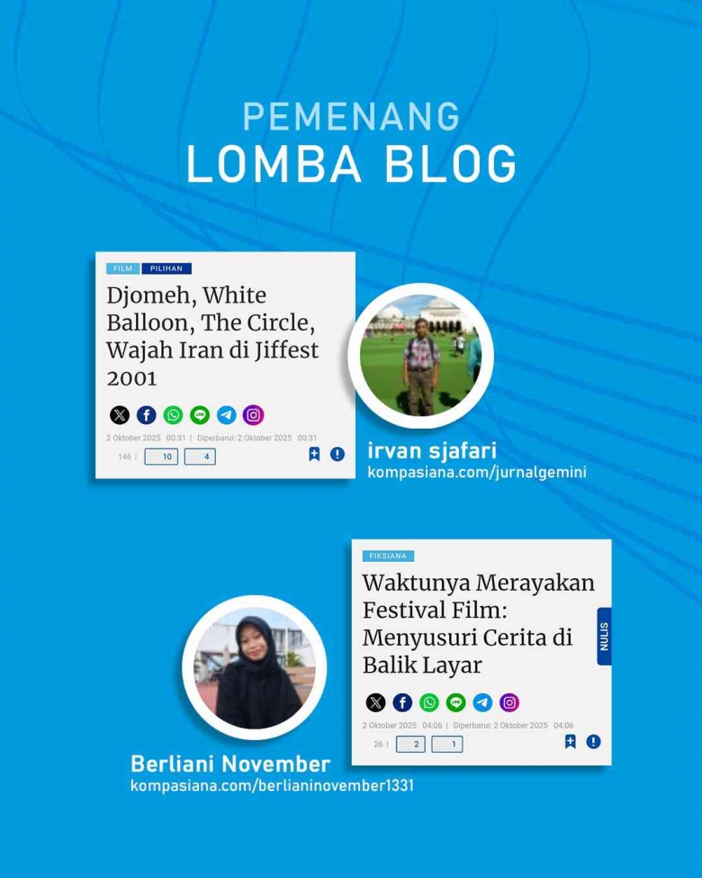 Selama kurang lebih dua minggu, terkumpul 17 artikel di Kompasiana dan sejumlah konten medsos tentang Festival Film. Tanpa berlama-lama inilah dia para juaranya.