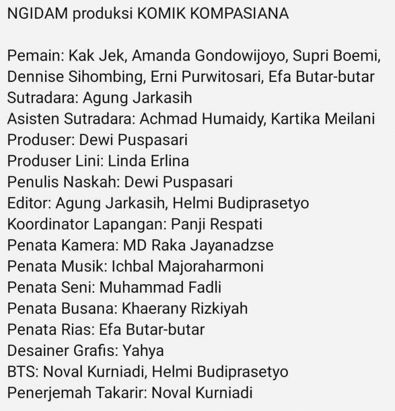 Komiker yang terlibat dalam film ini ada banyak. Mereka adalah Erni Purwitosari alias Denik, Efa Butar butar, Clara Agustin, Riap Windhu, Muhammad Syifa Syarofi, dan Nuty Laraswaty.