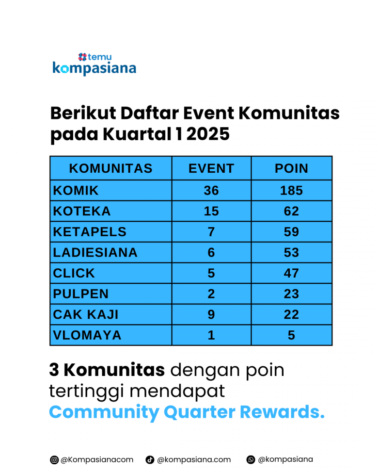 Penilaian event di atas berdasarkan report yang dikirimkan oleh masing-masing komunitas, dan disesuaikan dengan mekanisme terbaru yang sudah disosialisasikan ke admin komunitas di awal tahun. Selengkapnya bisa dibaca melalui: Berikut Mekanisme Baru Community Quarter Rewards 2025.