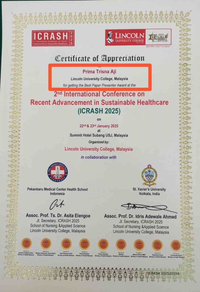 Penghargaan ini merupakan salah satu penghargaan bagi Dosen yang telah berhasil mempresentasikan hasil temuannya di Seminar Internasional diluar negeri. Seminar Internasional yang diselenggarakan di Hotel Summit Subang Jaya Selangor Malaysia bertema ICRASH Tahun 2025.