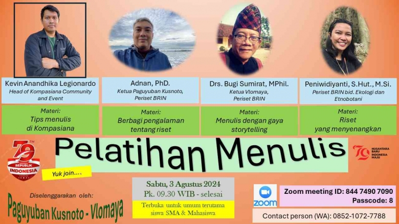 3). Drs. Bugi Sumirat, MPhil. (Ketua Vlomaya, Periset BRIN). Judul Materi: Menulis dengan gaya storytelling.